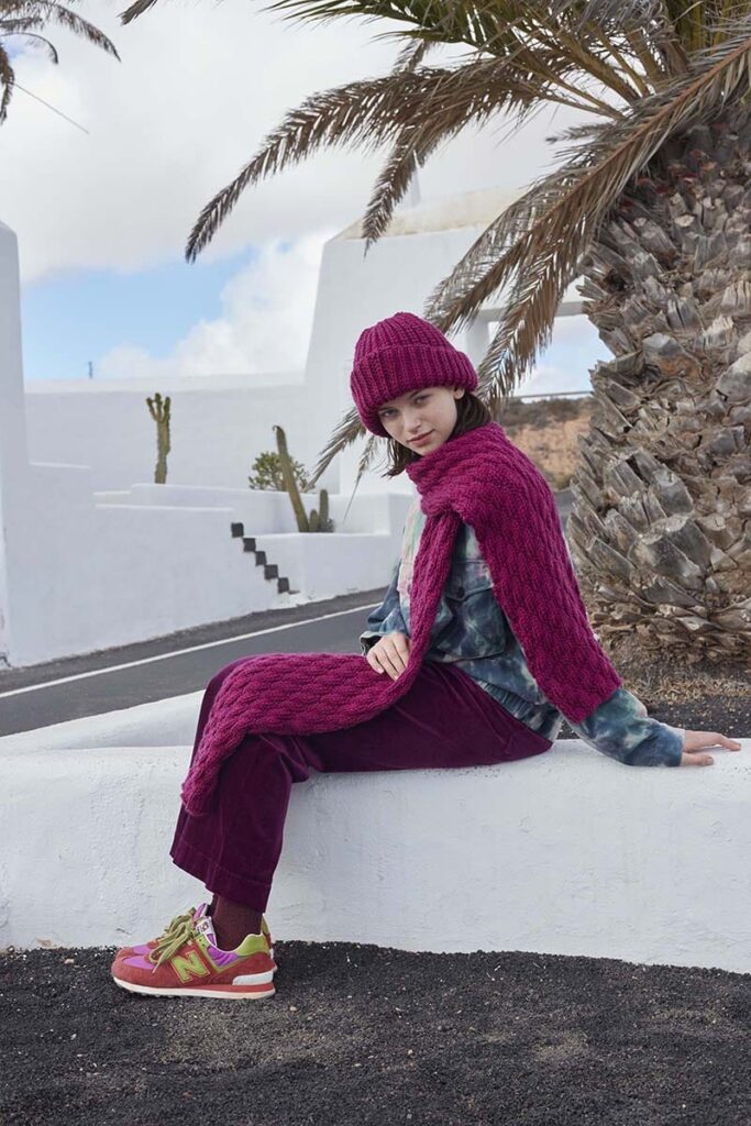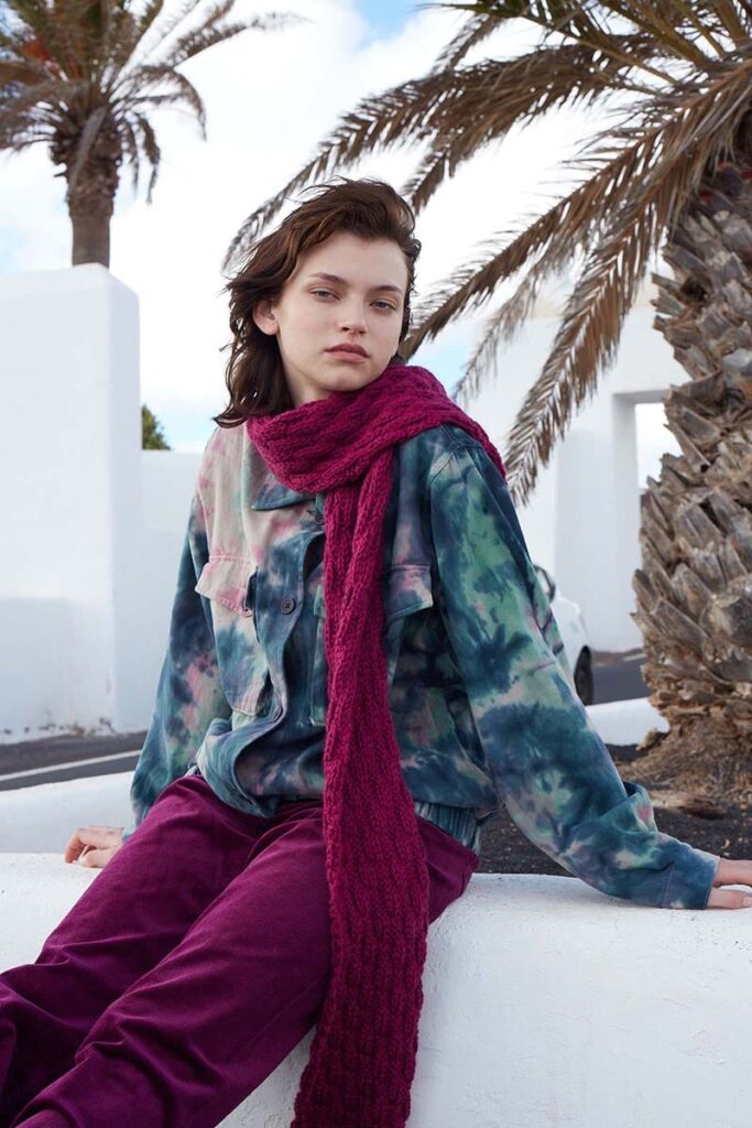 The stitch pattern and voluminous yarn come together, creating a velvety texture that is both sumptuous and refined, transforming this scarf into a tactile delight, reminiscent of the luxurious touch of velvet.