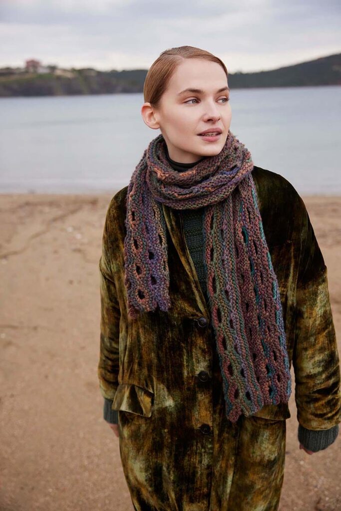 A symbol of continuity and connection, the FULL CIRCLE scarf features circular openings that flow seamlessly throughout its design. Knit width-wise, its unique construction uses strategically placed bind-offs and cast-ons to create these ‚cut-out‘ spaces, adding visual intrigue and a sense of movement. Just like lifes cycles, the yarn comes back around.