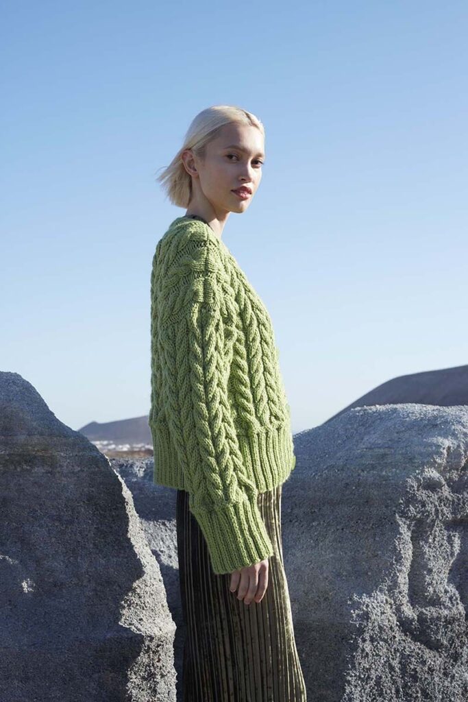 Much like leaves on a branch or intricately tangled vines, the cables on this cardigan burst forth with vibrant life. While knitting the APPLIED BOTANY cardigan may demand some sustained application, the glorious result is undoubtedly worth the investment.