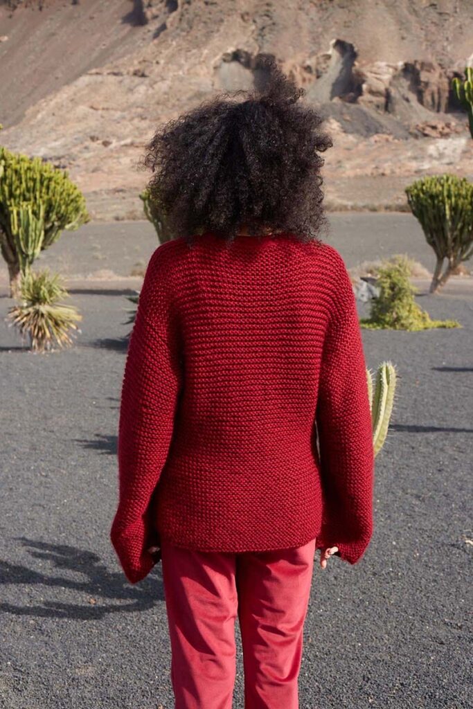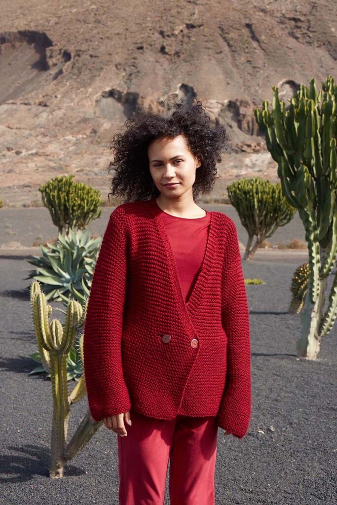 A double-breasted jacket knit in squishy garter stitch, FLAMING HUE envelopes you with warmth and style. The rhythmic undulation of the garter stitch, reminiscent of dancing flames, not only speaks to but also ignites the inner fire of your creativity, transforming each stitch into a vibrant expression as you breathe life into the embers of this project.