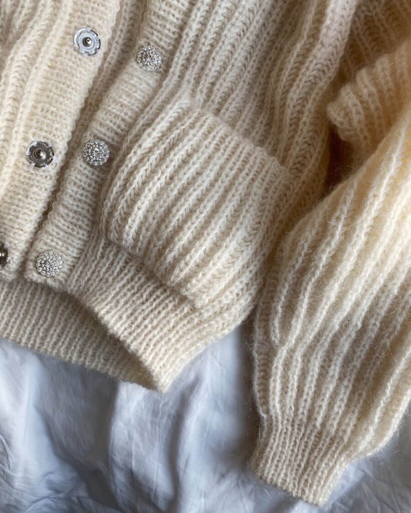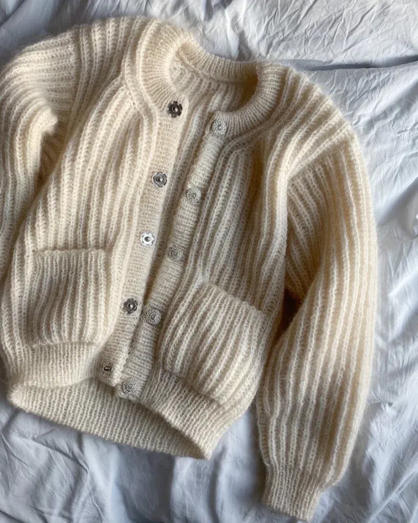 Die September Jacke wird von oben nach unten im Patentmuster mit 1 Faden Sunday und 2 Fäden Tynn Silk Mohair gestrickt. Zuerst wird die Rückseite gestrickt, danach die rechte, dann die linke Schulter. Diese 3 Teile werden dann für den Rumpf auf einer Rundstricknadel gesammelt, der in Reihen hin und zurück im Patentmuster gestrickt wird. Die Ärmel werden aus den aufgenommenen Maschen am Armausschnitt gestrickt. Zuletzt werden noch Blenden entlang der vorderen Jackenkanten als Knopfleisten gestrickt, wie auch ein Bündchen im Rippenmuster entlang des Halsausschnittes. Die Taschen werden ebenfalls im Patentmuster gestrickt und zuletzt auf der Jacke befestigt. Die Jacke wird mit Druckknöpfen geschlossen.