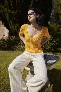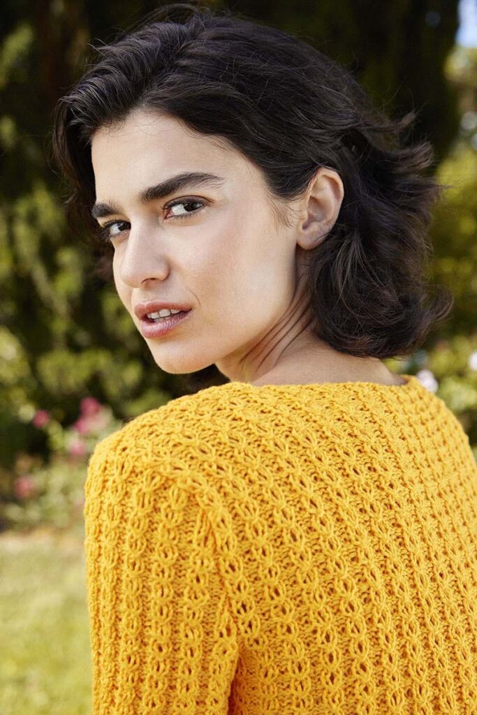 The all-over mock-cables on this V-neck resemble ivy meandering up the walls of a castle tower. With its nature-inspired pattern and fine yarn, the CLIMBING IVY top is a labor of lovebut after all, a castle isnt built in a day either.