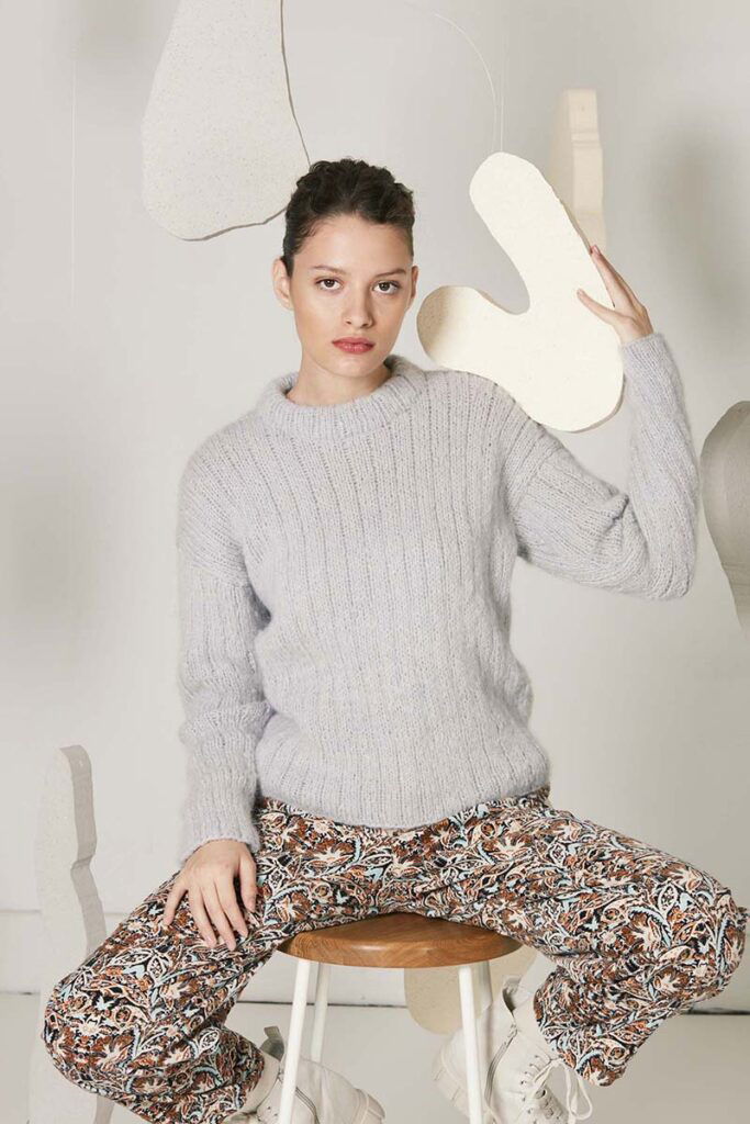 Wenn Sie einen längeren Blick auf die Textur dieses Pullovers werfen, werden Sie feststellen, wie wunderbar wollig er ist. Vielleicht erinnert er Sie sogar an die ersten Schneeflocken, die vom Himmel wirbeln…. So oder so bleibt es etwas Magisches, was zwei Nadeln bewirken können.
