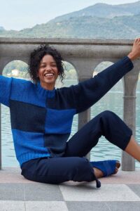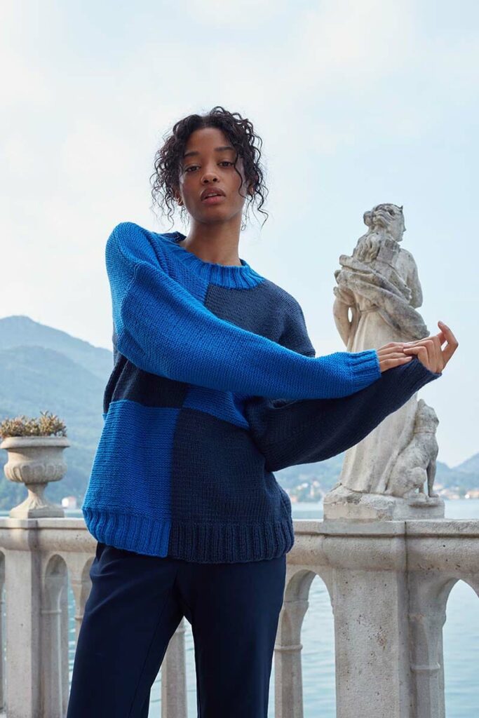 All you need on vacation is vitamin sea. How radiant Marianne is in this photo! This is a classic of ours that does well time and time again. The sweater is made of «HAPPINESS» which makes it wonderfully soft. Get started with the colorblocking theme! Because we have so many different shades available, you can create the most perfect sweater at a glance.