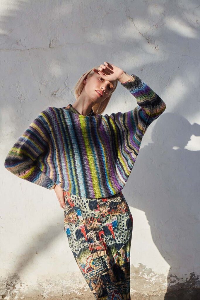 The NORTHERN LIGHT poncho-sweater boasts a distinctive construction and vibrant stripes that evoke the enchanting hues of the aurora. Its effortless style makes it the ideal piece to throw on when stepping outside to witness any celestial spectacle the night sky has to offer.