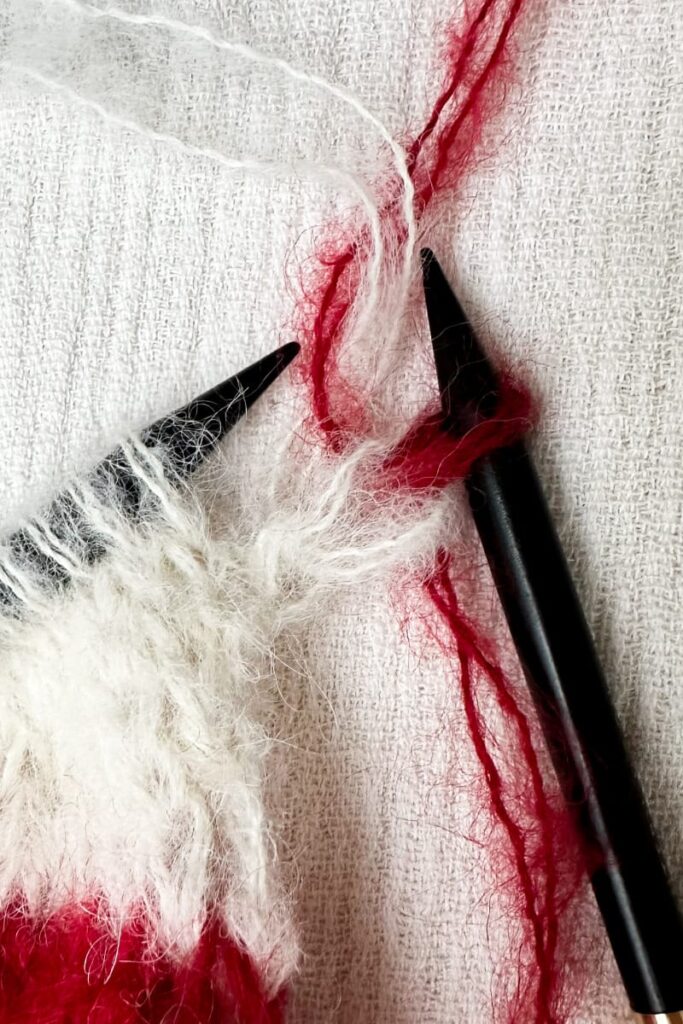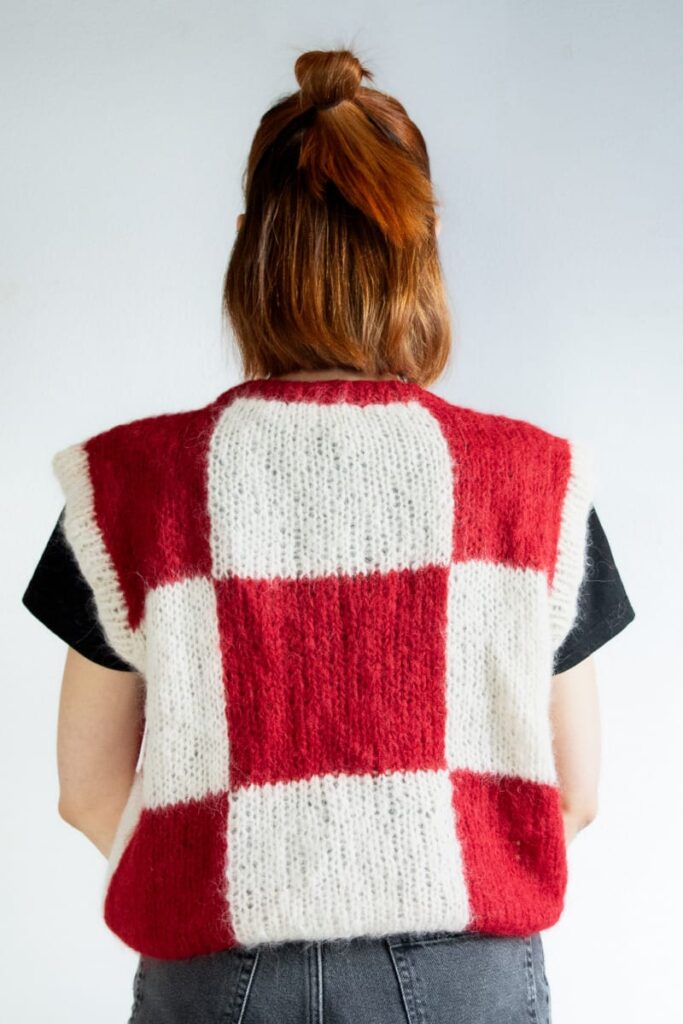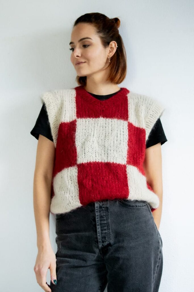 Die 1. Veste wurde mit Farbe 1: ROT 1082.0060 und Farbe 2: OFFWHITE 1082.0094 gestrickt.