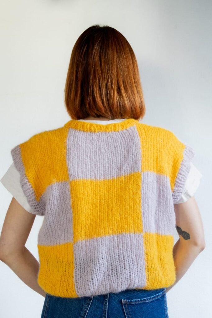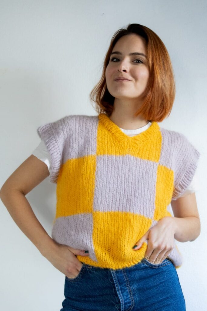 Die 2. Veste wurde mit Farbe 1: DUNKELGELB 1082.0013 und Farbe 2: ROSÉ 1082.0019 gestrickt.
