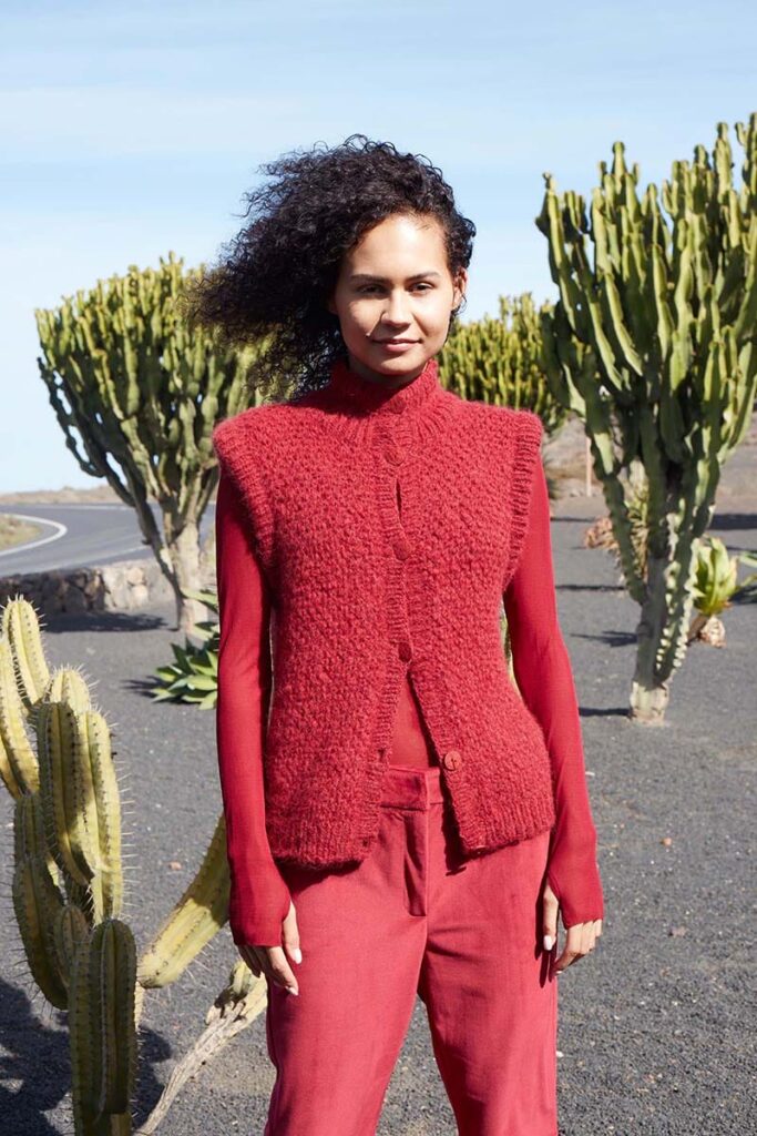 This textured vest is a meditative knitting journey. Intricately designed with a blend of knit and purl stitches, it creates a tapestry of tactile richness that mirrors the layers of calm found in a serene sanctuary. Embark on this project to discover your own, personal knitting sanctuary.