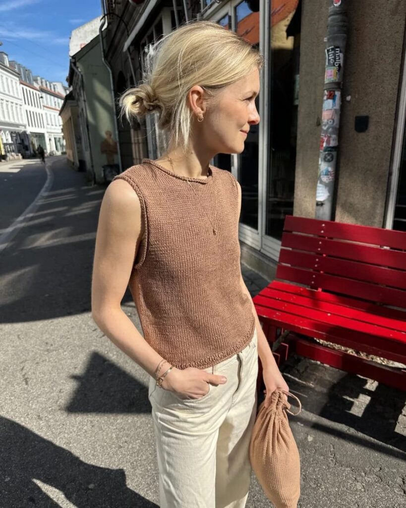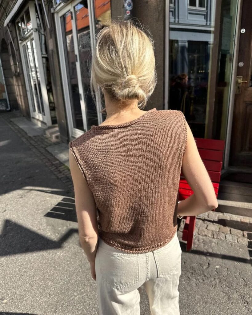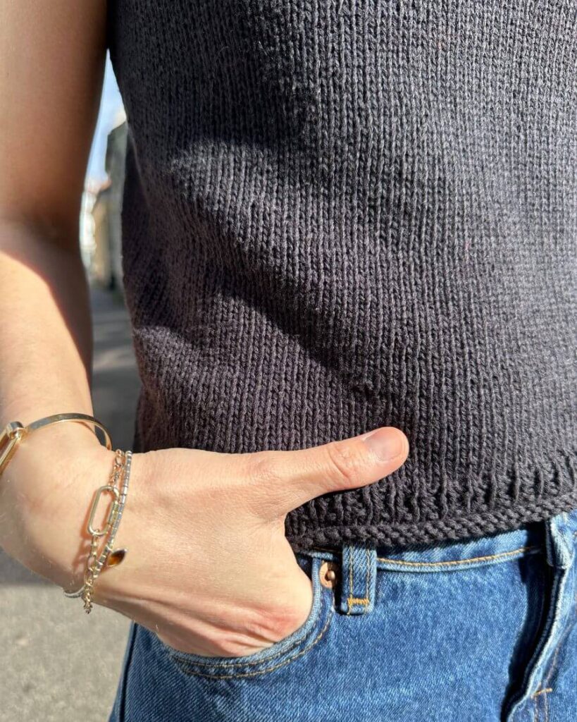 Bedenke, dass das Top mit doppeltem Faden gestrickt wird. Der angegebene Garnverbrauch ist der Gesamtverbrauch.