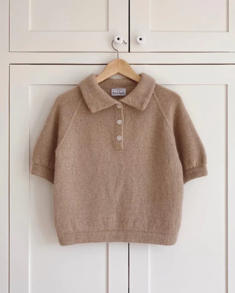 Das Maude Tee wird in einem Stück von oben nach unten gestrickt. Zuerst wird der Kragen gearbeitet, danach die Passe und zuletzt Rumpf und Ärmel. Der Kragen wird so in Runden gestrickt, dass er sowohl in Hin- wie auch Rückreihen glatt re erscheint. Die Knopfleisten des Shirts werden mit double face (Doppelstrick) gestrickt, so dass sie ebenso in Hin- wie auch Rückreihen glatt re erscheinen. Mit Hilfe von verkürzten Reihen entsteht der Halsausschnitt. Die Passe selbst wird mit Raglanzunahmen geformt.