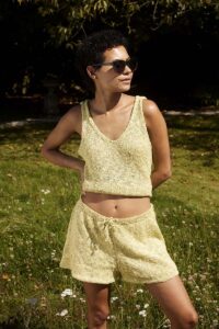 A drawstring short with wide legs paired with a matching tankdoesn’t it just scream peak summer vibes? This outfit is perfect for enjoying a laid-back day, letting yourself knit, relax, and listen to a custom playlist. Top SUMMER PLAYLIST pared with short DAYLIGHT JAM.