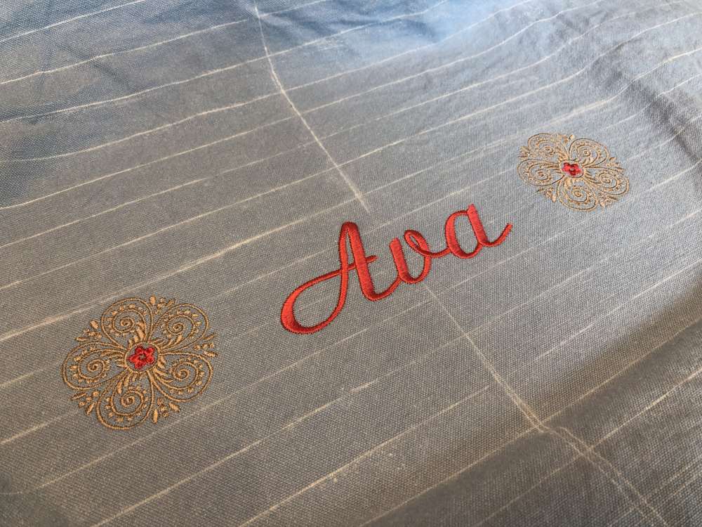 Als Vorbereitung habe ich schon einmal den Namen des Taufkindes mit einem schönen Ornament in die Mitte des Kissens gestickt. Die schönen Ornamente sind übrigens von der Embroidery Library.