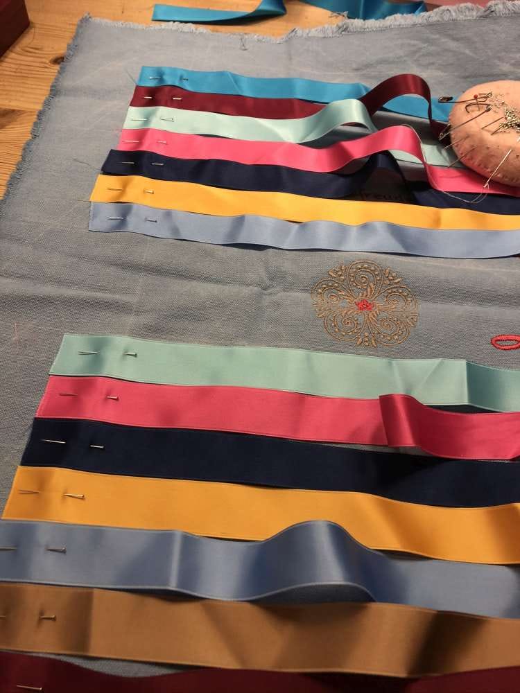 Leg die Satinbändel in der gewünschten Reihenfolge auf die Linien und stecke sie mit einer Stecknadel fest.