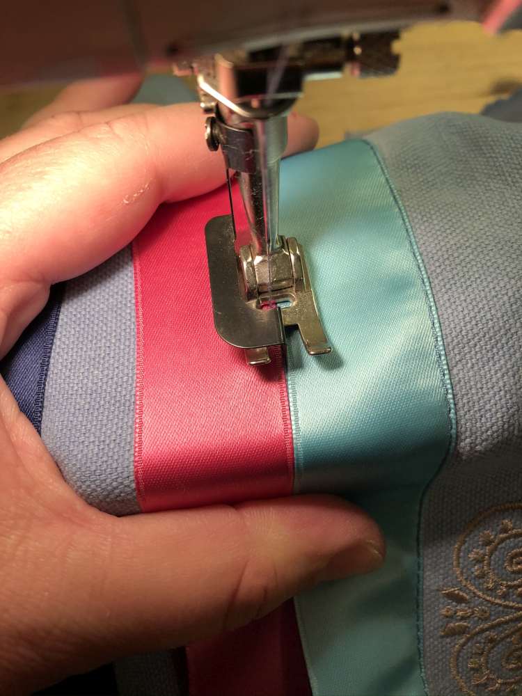 Nähe einen Bändel nach dem anderen mit dem Schmalkantfüsschen an. Ich habe dabei jeweils die passende Fadenfarbe gewählt.Achte darauf, dass du nicht den darüberliegenden Bändel mitfasst – die Bändel sollten alle nur nebeneinander liegen und nicht übereinander kommen.Natürlich muss man exakt arbeiten, aber ich fand, es ging relativ gut, da ich die Linien exakte aufgezeichnet hatte.
