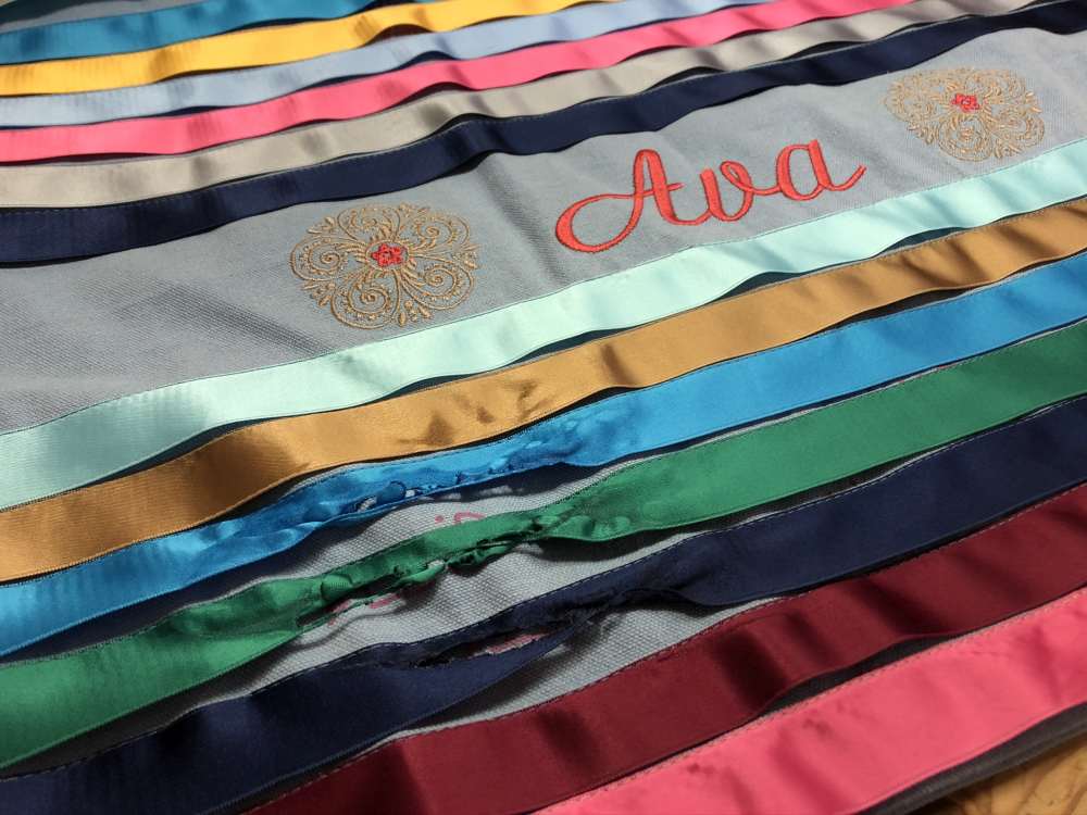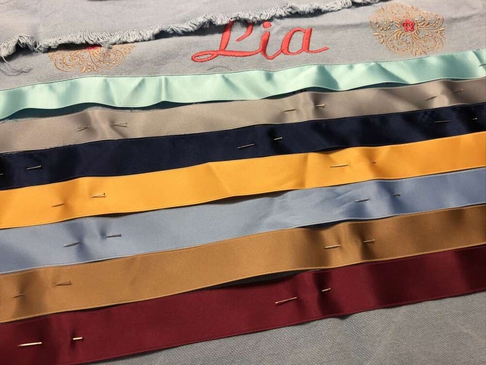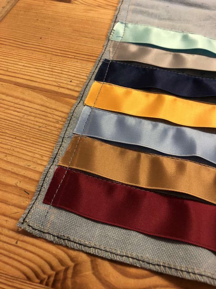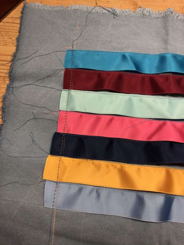 Nun nähst du die Satinbändel auf das Kissen auf. Überleg dir zuerst, in welcher Reihenfolge du die Farben platzieren möchtest. Dafür kannst du sie einfach mal auf dem Tisch auslegen und Farbkombinationen ausprobieren.