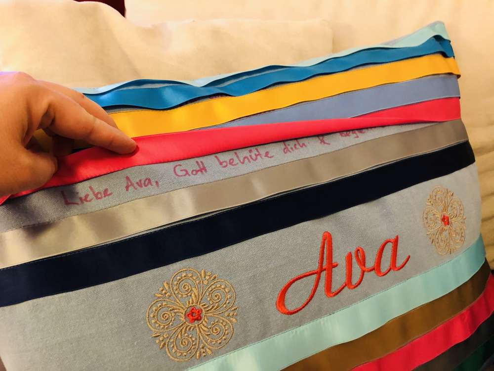 Ich hab dann nach dem Fest die schönen Satinbändel – von welchem jeder für einen guten Wunsch an der Taufe steht – über diese Linien mit den guten Wünschen genäht, so dass ein buntes Kissen entstand. Da ich jeweils nur die obere Kante des Satinbandes festgesteppt hatte, kann man jederzeit die Bändel hochheben und die guten Wünsche lesen.