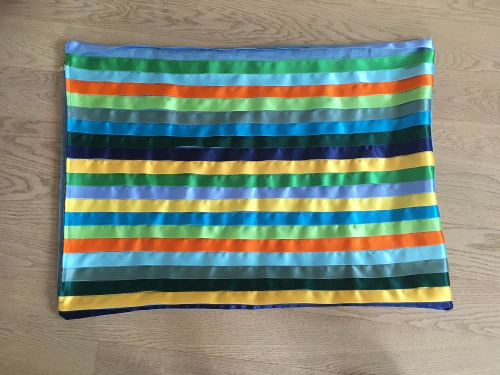 Viele bunte Satinbändel in ca. 2 cm Breite. Bei einem 50 cm hohen Kissen braucht es also 25 Bändel à 75 cm (das Kissen ist ca. 70 cm breit).