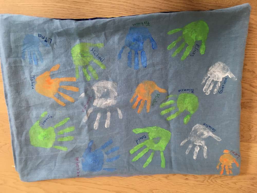 Alle Kinder dürfen dann ihren Handabdruck aufs zweite Stoffstück machen und ihren Namen aufschreiben. Natürlich darf auch das Taufkind mitmachen!