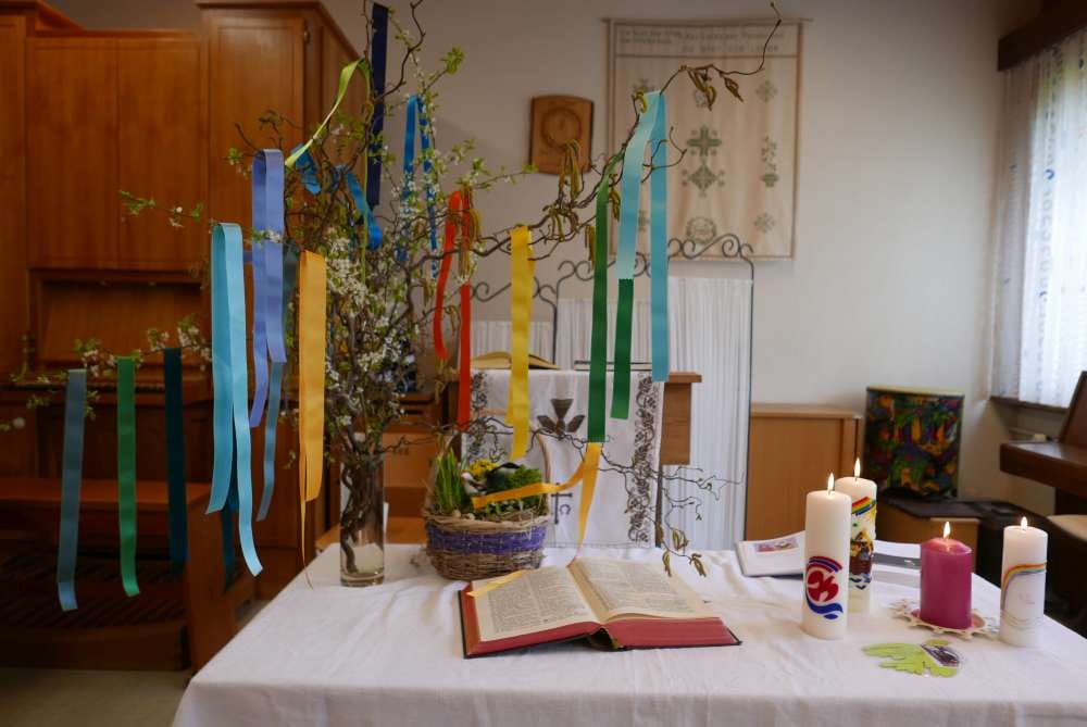 Ich stellte ein paar Äste in einer grossen Vase in der Kirche auf. Nach der Taufe durften alle Taufgäste, die wollten, einen Satinbändel nehmen und diesen mit dem Gedanken eines guten Wunsches an einen der Äste hängen. Dies kann ganz still passieren, Alt und Jung können mitmachen und ich fand es sehr schön, als alle nach vorne gegangen sind und dem Kind einen guten Wunsch auf seinen Lebensweg mitgegeben hat.