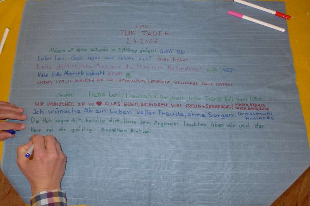 Für die Erwachsenen – Nach dem feinen Taufessen wird ein Stück Stoff mit Linien aufgelegt und die Gäste – Grosseltern, Gotte und Götti, etc. – dürfen auf eine der Zeilen einen guten Wunsch für den Täufling notieren. Auch der Taufspruch kann so verewigt werden.