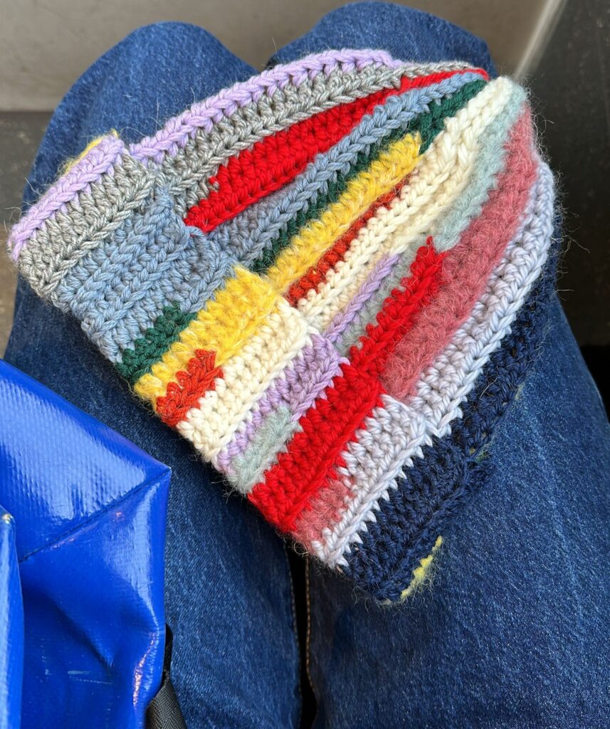 «Da gestrickt/gehäkelt die Farben bereits das Projekt stark mustern, würde ich eher auf komplizierte Techniken verzichten und glatt rechts stricken, respektive mit festen Maschen bis Stäbchen häkeln. Ich habe hier einen simplen Raglan-Pullover gestrickt. Gehäkelt habe ich ein Beanie, welches ich mit halben Stäbchen jeweils durch das hintere Maschenglied gehäkelt habe. Schau auch, dass du eher zu viel Wolle einplanst, als zu wenig. Lieber machst du noch ein weiteres kleines Zero-Waste Projekt, als dass du am Schluss dann doch für dein Projekt noch mehr neue Wolle kaufen musst.»