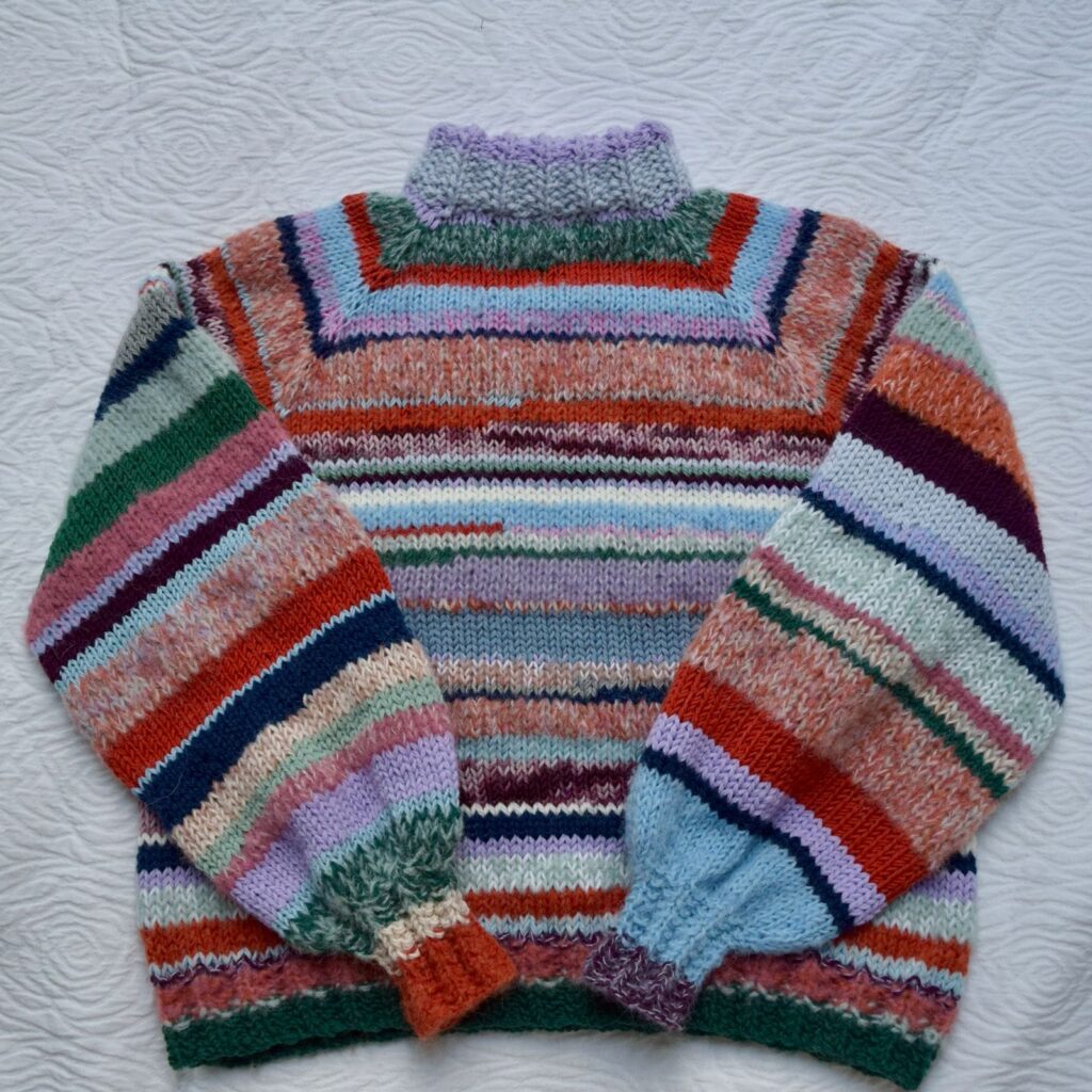 6. Damit der Effekt der verschiedenen Farben künstlerisch abwechslungsreich aussieht, wenn die Farben gestrickt/gehäkelt sind, kannst du schauen, dass du Fäden von unterschiedlicher Länge nacheinander nimmst, damit gestrickt/gehäkelt der eine Teil mal mehrere Reihen breit nur kurz, wie bei meinem Pullover. Ich habe auch immer darauf geachtet, dass die Farben, die nacheinander kommen, schön nebeneinander aussehen und dass ich auch regelmässig helle und dunkle Farben, sowie blasse und knallige Farben verteile.