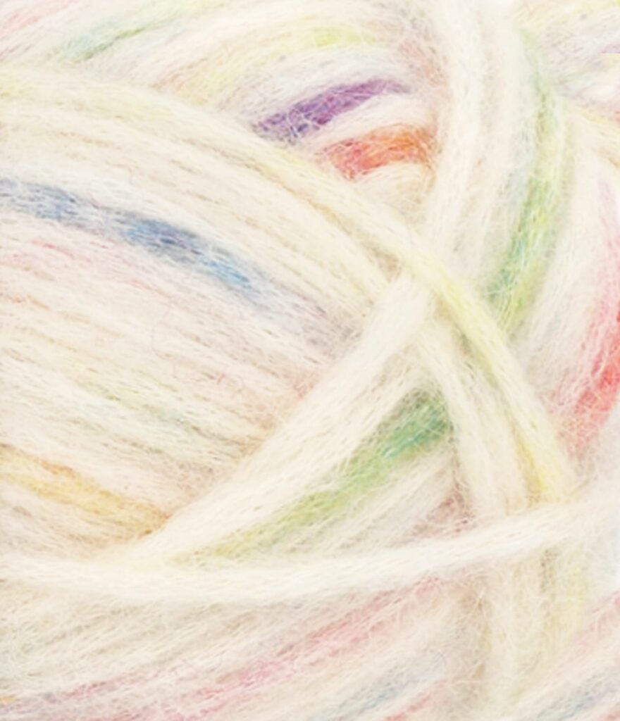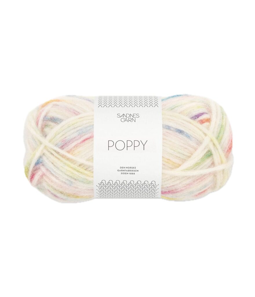 Poppy besteht aus Alpakafasern, die zusammen mit Wolle in einen Baumwollstrumpf geblasen werden. Dadurch entsteht ein weiches, leichtes und luftiges Garn