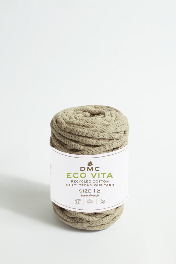 Verwenden Sie dieses 12 mm dicke Schlauchgarn zum Stricken, Häkeln oder Makramee-Knüpfen von Körben, Blumenübertöpfen, Kissen, Lampenschirmen und mehr! Eco Vita 12 besteht zu 80% aus recycelten Materialien und ist ein umweltbewusstes Garn, das mit dem Gedanken der Nachhaltigkeit gesponnen wurde.