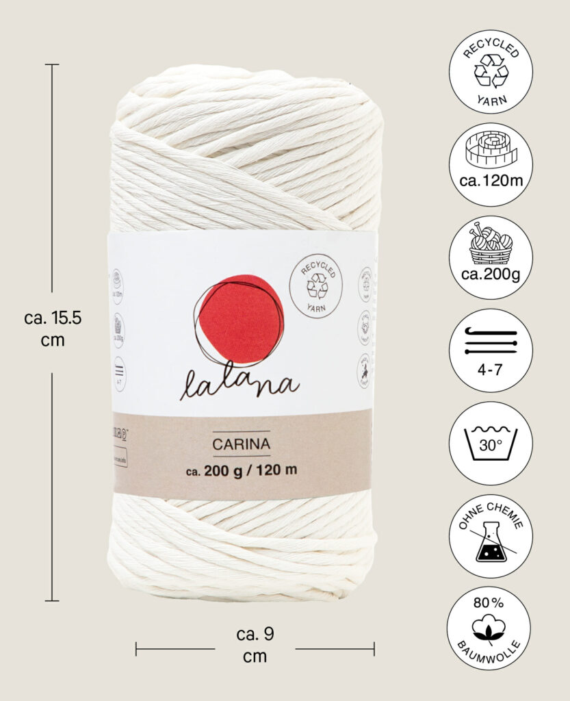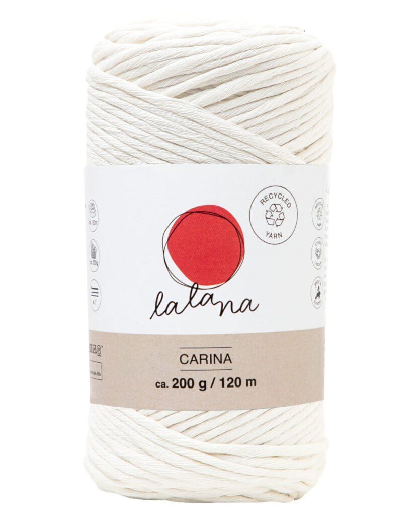 lalana Carina ist ein weiches und flexibles Garn. Das angenehme Carina Garn mit losen Fäden eignet sich für fast all deine Projekte, häkeln, stricken, Makramee ist alles möglich.