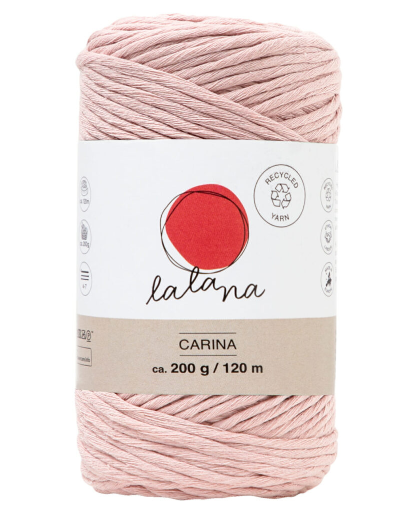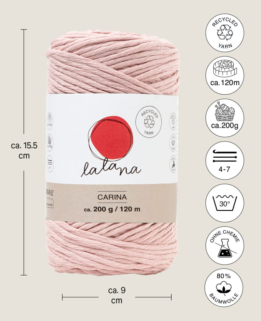 lalana Carina ist ein weiches und flexibles Garn. Das angenehme Carina Garn mit losen Fäden eignet sich für fast all deine Projekte, häkeln, stricken, Makramee ist alles möglich.