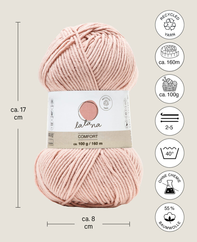 lalana Comfort ist durch seinen hohen Baumwollanteil sehr weich auf der Haut und kratzt nicht. Es ist perfekt, ob gestrickt oder gehäkelt, für alle Projekte im Bekleidungsbereich bestens geeignet.
