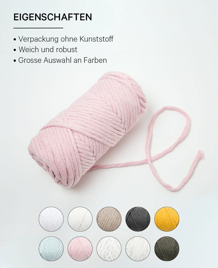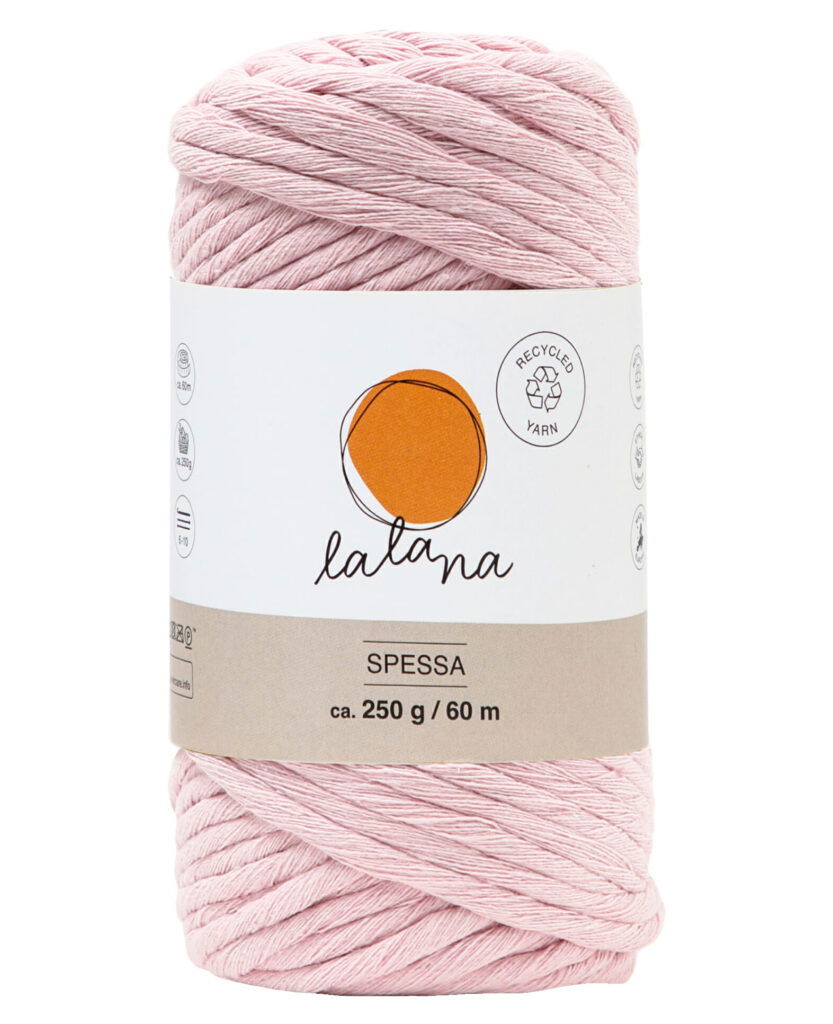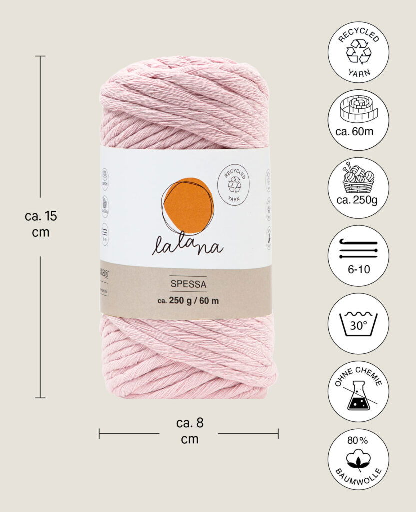 lalana Spessa ist ein dickes Makramee-Baumwollgarn aus 80 % Baumwolle, 20 % Mischfasern. Mit dem Garn kannst du schönste DIY Makramee und XL Häkel- Strick- und Webkreationen anfertigen.