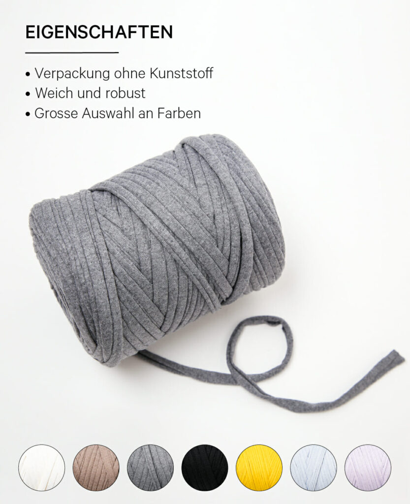 lalana T-Shirt revive ist ein dickes Texilgarn aus 80 % receyclierten Baumwollfasern mit welchem modische Taschen, Körbe sowie trendige Wohnaccessoires wie Kissen, Sitzkissen, Teppiche usw. verarbeitet werden können.