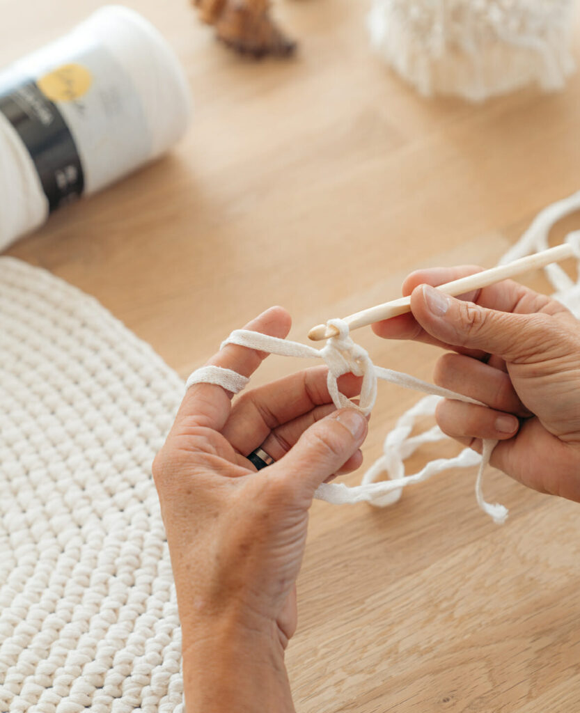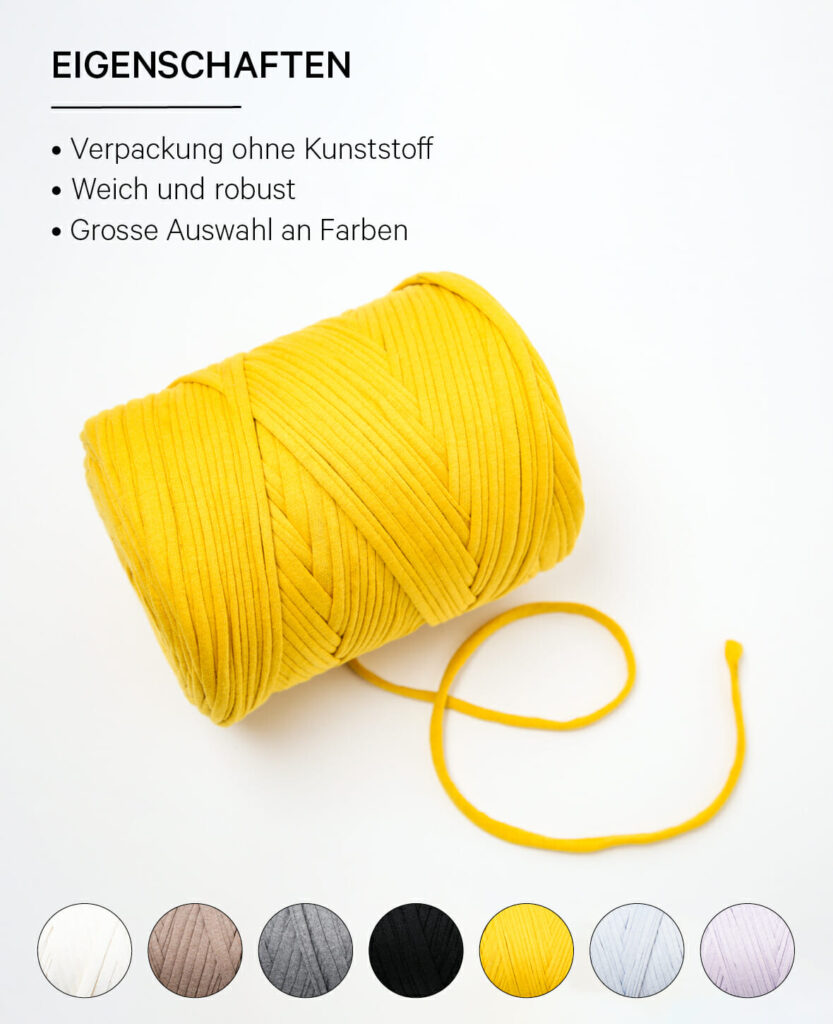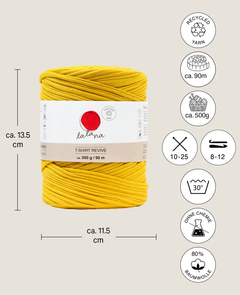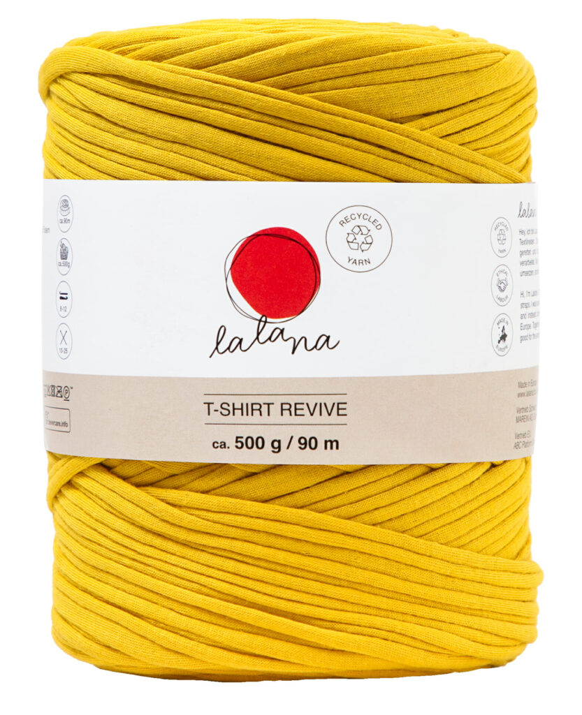 lalana T-Shirt revive ist ein dickes Texilgarn aus 80 % receyclierten Baumwollfasern mit welchem modische Taschen, Körbe sowie trendige Wohnaccessoires wie Kissen, Sitzkissen, Teppiche usw. verarbeitet werden können.