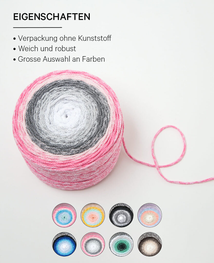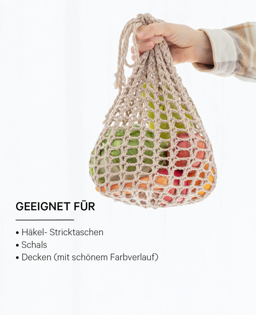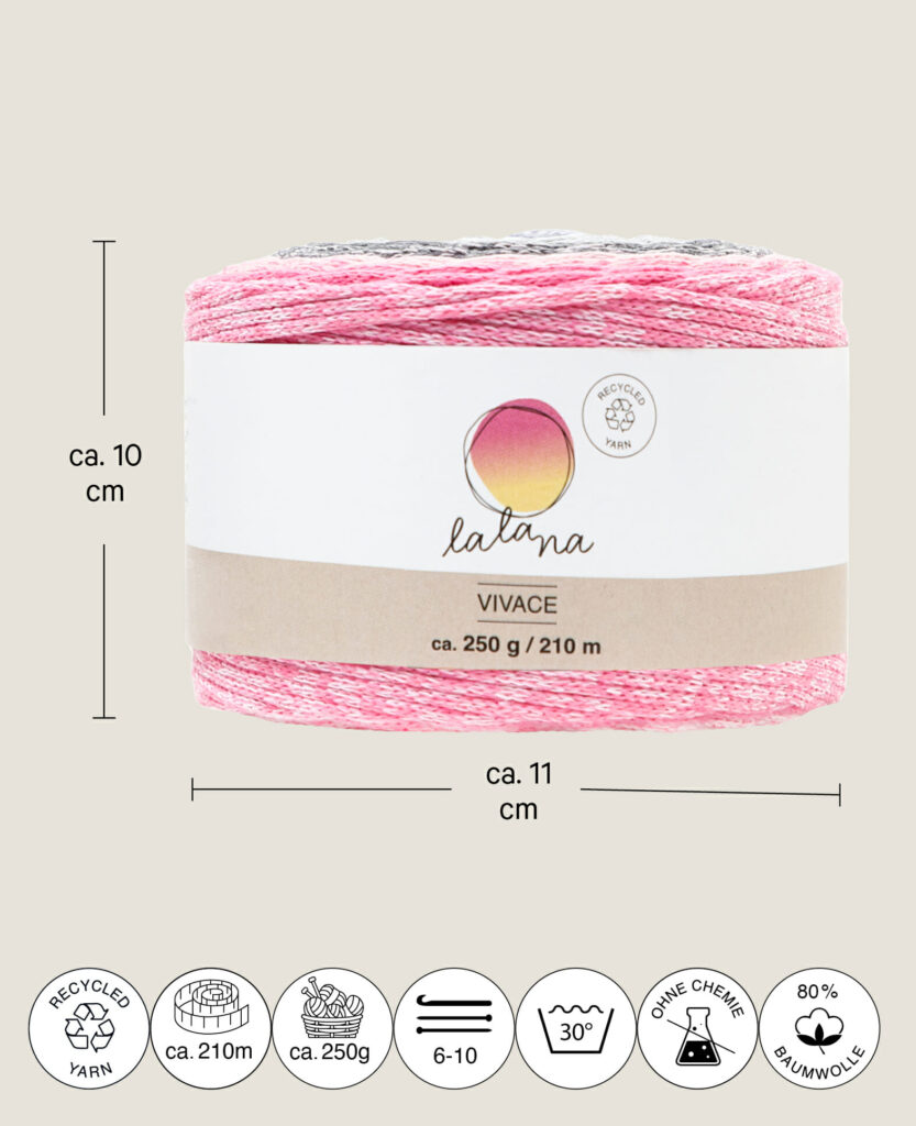lalana vivace ergibt super schöne Farbverläufe! Das receyclete Garn aus 80 % Baumwolle und 20 % Mischfasern ist softig weich und hervorragend zur Verarbeitung von Häkel- Stricktaschen, Schals, Decken usw.