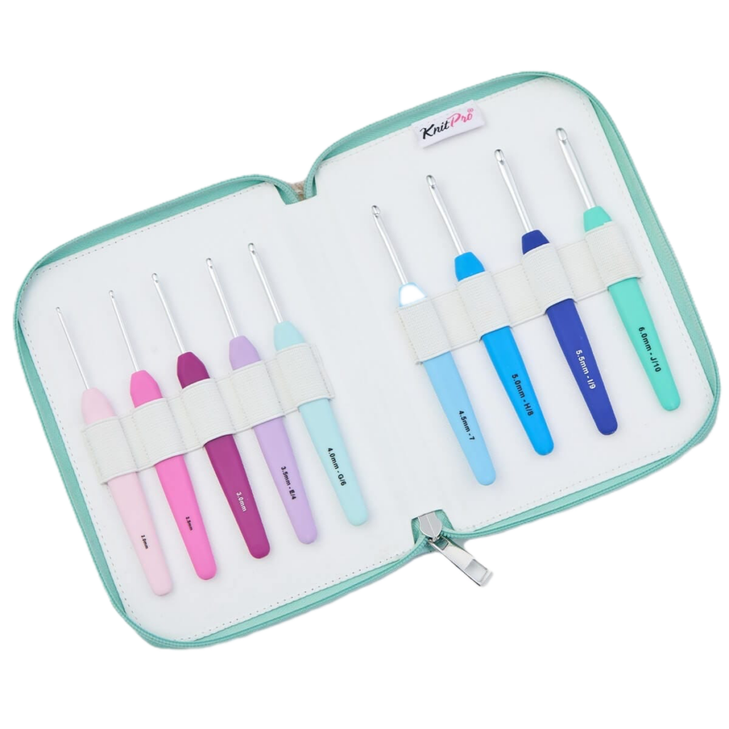 Das Waves Deluxe Set bietet eine grosszügige Kollektion von 9 Aluminium-Häkelnadeln in den Grössen 2.0 – 6.0 mm. Die glatten Aluminiumhaken ermöglichen ein komfortables Häkeln. Das ergonomische Design der bunten Gummigriffe passt bequem in die Hände. Die farbcodierten Griffe sind zur einfachen Identifizierung und werden individuell, jede an ihrem Platz gehalten. Das Set hat gängige Häkelnadelgrössen, die für eine Vielzahl von Projekten geeignet sind, was sie sowohl für Anfänger, die gerade erst mit ihrem Häkelabenteuer beginnen, als auch für erfahrene Häkelnde, die nach hochwertigen Werkzeugen suchen, ideal macht.