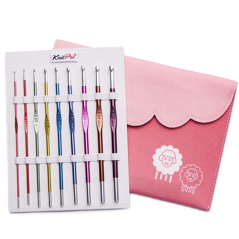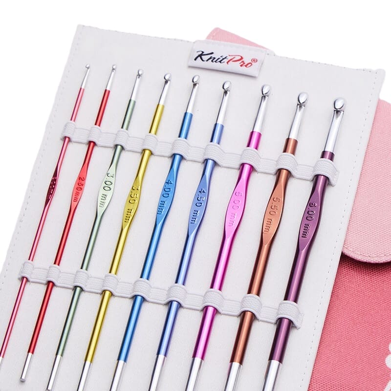 9 Einzelhäkelnadeln (2.00, 2.50, 3.00, 3.50, 4.00, 4.50, 5.00, 5.50 und 6.00 mm) sind in einem attraktiven rosa Stoffetui verpackt.