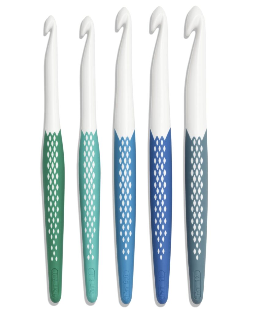 Mit Geschenken eine Freude bereiten – und das mit Stil! Da bietet sich das Wollhäkelnadel-Set prym.ergonomics an, denn sein Inhalt besteht aus 5 hochwertigen Wollhäkelnadeln in den Stärken 7,0 mm, 8,0 mm, 9,0 mm, 10,0 mm und 12,0 mm. Die Nadeln liegen leicht und angenehm warm in der Hand, der spezielle, leichte Kunststoff sorgt dabei für ein einfaches, gelenkschonendes Handarbeiten. Während der lange, glatte Schaft und der optimierte Haken die Maschen mühelos gleiten lassen, ist der ergonomisch geformte Griff aus rutschfestem Kunststoffmaterial Garant für ein ermüdungsfreies Häkeln. Die Farbgebung des Griffs entspricht der jeweiligen Nadelstärke – so ist die gewünschte Häkelnadel im Handarbeitskorb schnell gefunden. Mit der Verpackung im farblich passenden Design wird dieses Set große und kleine Häkel-Fans begeistern.