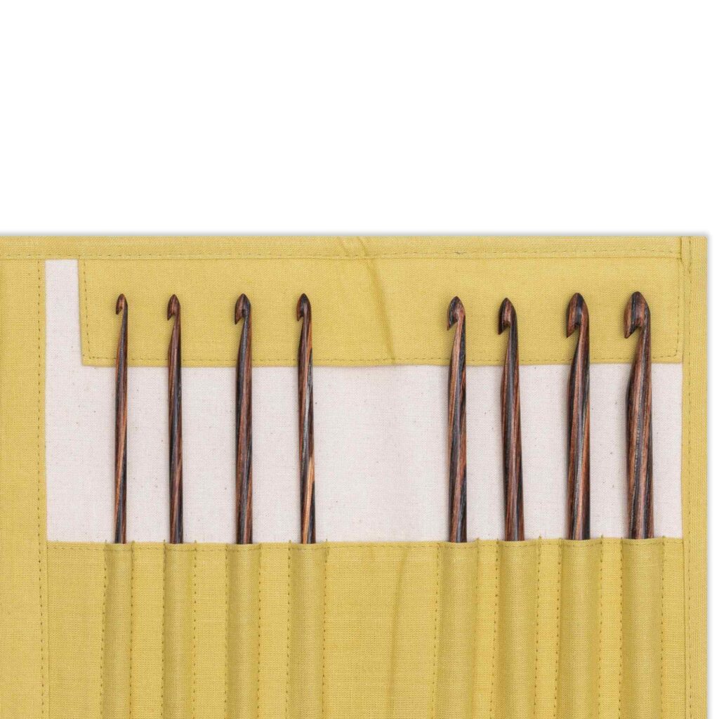 Für die tunesische Häkeltechnik werden spezielle, nämlich tunesische Häkelnadeln benötigt. Es entstehen moderne Muster, die wie gewebt wirken. In diesem Set sind acht edle Wollhäkelnadelspitzen in den Nadelstärken 3,5-8 mm und vier verschieden lange Seilchen in den Längen 50-110 cm enthalten. Die Seilchenlänge ist inklusive der Nadelspitzen gemessen. So kann die Tunesische Häkelnadel komfortabel für unterschiedliche Projekte wie Kissen, Decken, Tücher, Tischsets oder auch Topflappen mit dem entsprechend langen Seil kombiniert werden. Maschenstopper sorgen für einen sicheren Halt. Die tunesischen Häkelnadelspitzen aus der Serie NATURAL sind aus fein gemasertem Holz mit edler, individueller Holzmaserung gefertigt und bestechen durch ihre angenehme, warme Haptik. Die Oberfläche ist glattpoliert und der Übergang zwischen Schaft, Hülse und Seilchen ist absolut widerstandslos. In der Aufbewahrungstasche sind die Häkelnadelspitzen gut organisiert untergebracht, zusammengerollt können sie platzsparend und sicher verstaut werden. Die Farbkombination in senfgelb-beige setzt außerdem einen Farbakzent zu den braunen Farbtönen der hochwertigen Holznadeln. Das Zubehör bestehend aus Maschenstoppern und Montagewerkzeug ist sicher in der innenliegenden Reißverschlusstasche verstaut. Einfach praktisch für zuhause und für unterwegs.
