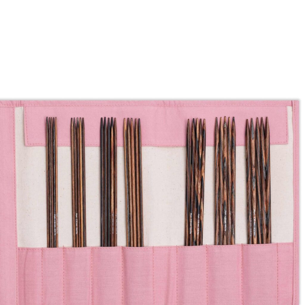 Dieses Lieblingsset für Sockenstricker bringt das Thema Nachhaltigkeit überzeugend auf den Punkt, denn die Nadeln sind aus geschichtetem, nachhaltigem Holz gefertigt und werden in einer Baumwoll-Mappe geliefert. Mit dem Set aus sieben unterschiedlichen Strumpfstricknadeln kommen Vielstricker voll auf ihre Kosten, denn hiermit lassen sich von Socken über Handschuhe bis hin zu Mützen kleine bis größere Strickprojekte problemlos realisieren. Die Stricknadeln überzeugen auch durch ihre extrem glatte Oberfläche – dies ermöglicht ein müheloses Gleiten der Maschen über die Nadeln. Die Spitzen sind ideal geformt, so gestaltet sich das Einstecken der Nadel spielend leicht. Die Strumpfstricknadeln NATURAL sind 20 cm lang und jeweils als Nadelspiel in den Größen 2.00, 2.50, 3.00, 3.50, 4.000 und 4.50 mm enthalten. In der Aufbewahrungstasche sind die Nadelspiele gut organisiert untergebracht, zusammengerollt kann sie platzsparend und sicher verstaut werden. Die Farbkombination Rosé und Natur ergibt ein harmonisches Zusammenspiel mit den edlen, dunkelbraunen Holznadeln. In der innenliegenden Reißverschlusstasche kann zusätzliches Strickzubehör wie Nadelmaß, Maschenmarkierer, Reihenzähler oder Hilfsnadeln verstaut werden – einfach praktisch für zuhause und für unterwegs.