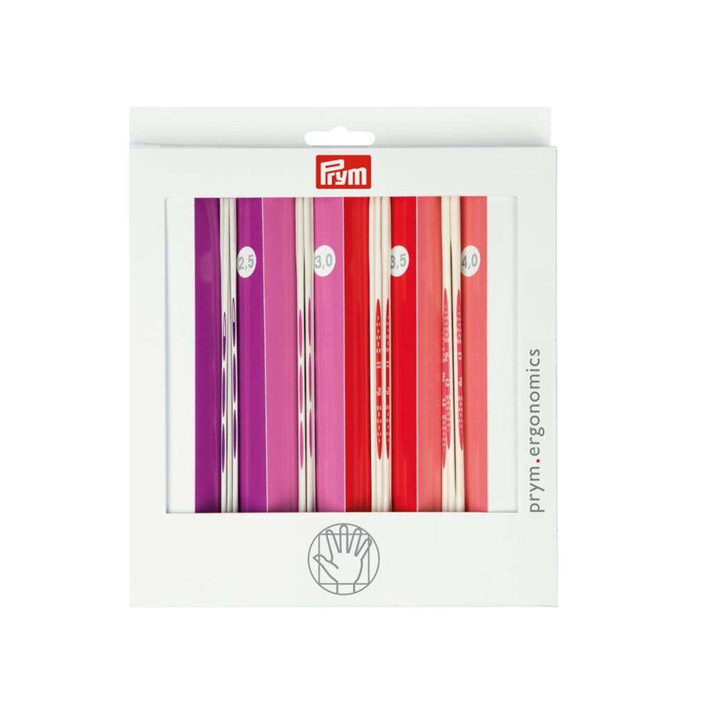 Dieses Strumpfstricknadel-Set der Serie prym.ergonomics ist nicht nur eine runde Sache, weil es seine 4 farbig bedruckten Nadelspiele in den Stärken 2,5 mm, 3,0 mm, 3,5 mm und 4,0 mm ausschließlich als Kollektion gibt, sondern weil es sich auch durch die schöne Verpackung hervorragend als Geschenk eignet. Die alabasterweißen Strumpfstricknadeln sind aus hochwertigem High-Performance-Kunststoff gefertigt, leicht biegsam und extrem leise während der Anwendung. Durch die tropfenförmigen Spitzen gestaltet sich die Fadenaufnahme und Führung beim Stricken von Strümpfen, Socken, Ärmeln und mehr deutlich einfacher und das Garn rutscht nicht so schnell von der Spitze. Die einzigartige, dreieckige Form des Schaftes gewährleistet ein freies Gleiten der Maschen auf dem Nadelschaft ohne lästiges Nachschieben. Jede Nadelstärke hat ihre eigene Farbe, sodass sich die 5 passenden Nadeln im Spiel schnell finden lassen.