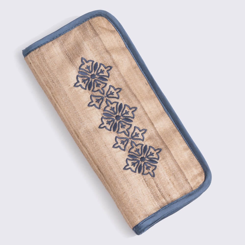 Das Etui ist aus Khadi-Seide gefertigt, ein traditionelles Material aus der indischen Kultur. Die Außenseite ist mit wunderschönen Blumenmotiven bestickt. Im Inneren ist Platz für mehrere Rundstricknadelpaare und Zubehör. Das Etui ist mit einem Reißverschluss versehen, so dass der Inhalt sicher und ordentlich aufbewahrt werden kann.