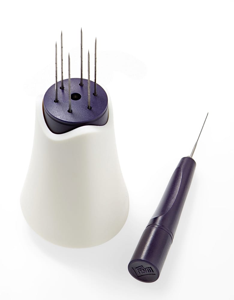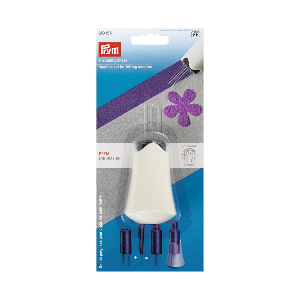 Das design-patentierte Filznadelgriffset aus der Reihe prym.ergonomics ist ein wahrer Alleskönner, wenn es um das Trockenfilzen geht. Das Set besteht aus drei Komponenten, die für die Arbeit mit den Filznadeln und deren Aufbewahrung unterschiedlich zusammengesteckt werden können. Der 6-fache Nadelhalter und der Griff für eine einzelne Nadel können zu einem Werkzeug mit maximal sieben Nadeln ineinander gesteckt werden. Die Einer-Version mit seiner ergonomisch geformten Griffmulde kann für die Detailarbeit separat verwendet werden. Zum Filzen, als Schutzkappe und zur sicheren Aufbewahrung dient der ergonomische Griff aus weißem, softem Kunststoff. Auf der Rückseite der Verpackung befindet sich eine bebilderte Anleitung, die das Wechseln der Nadeln und alle Funktionen erklärt. Das Filznadelgriffset wurde 2014 mit dem Red Dot Design Award ausgezeichnet.