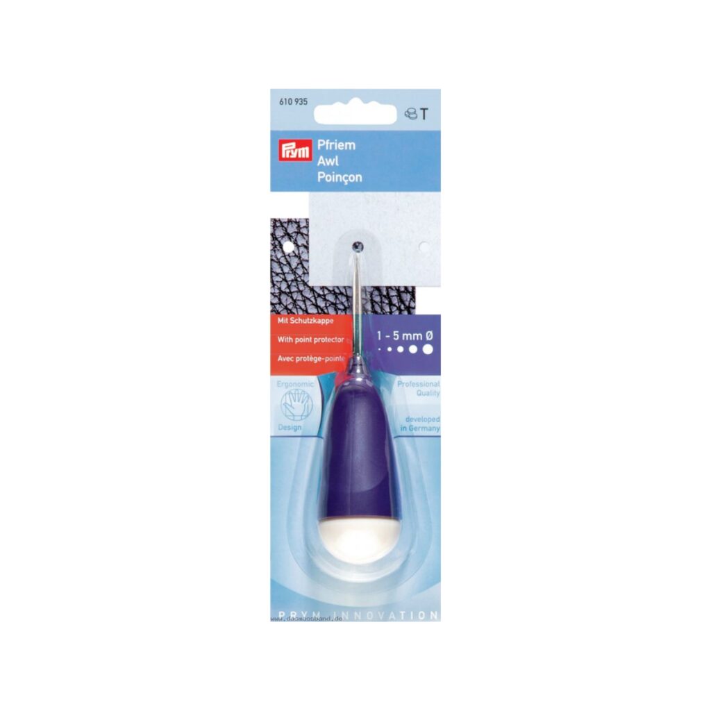 Wer ein Werkzeug zum Einstanzen von Löchern in Stoffe, Papier, Leder und vieles mehr sucht, ist mit dem Pfriem aus der Serie prym.ergonomics bestens aufgestellt. Seine ergonomischen Griffmulden ermöglichen ein ermüdungsfreies Arbeiten, ohne dabei mit den Fingern abzurutschen. Löcher in der Größe von 1 bis 5 mm lassen sich mit dieser handlichen Ahle mühelos in Textilien für z. B. Druckknöpfe anbringen. Die weiße Schutzkappe aus griffigem Softmaterial verschließt die Stahlspitze zum Schutz vor Verletzungen – der Pfriem lässt sich jetzt sogar hinstellen. Durch Aufstecken in den Griff des Lochwerkzeugs wird die abgerundete Kappe zur optimalen Auflagefläche für die Hand. Mit einem Band lässt sich der Pfriem auch umhängen und hat ihn damit stets zur Hand.
