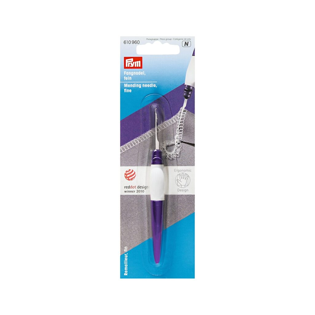 Diese feine Fangnadel aus der Serie prym.ergonomics beeindruckt durch ihre Vielseitigkeit, denn sie lässt sich ebenso zum Aufnehmen und Reparieren von Maschen in Wirkwaren als auch zum Faden einziehen und zur Fadenführung in Overlockmaschinen einsetzen. Eine Laufmasche in der Nylonstrumpfhose oder in einer Strickware? Die saubere Sicherung des Fadens bei Overlocknähten? Kein Problem für diese Fangnadel, die zudem durch ihr ergonomisches Design wie z. B. die rutschhemmenden Griffmulden ein leichtes, schnelles und ermüdungsfreies Arbeiten ermöglicht. Die Fangnadel wird inklusive Schutzkappe geliefert, die nach Umstecken auch als verlängerter Griff dient. Das lästige Suchen nach der Fangnadel während der Handarbeit entfällt ebenfalls, denn sie lässt sich mit Hilfe eines Bandes umhängen und ist damit immer zur Hand.